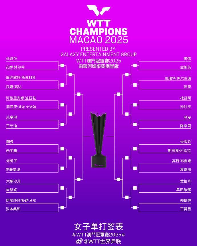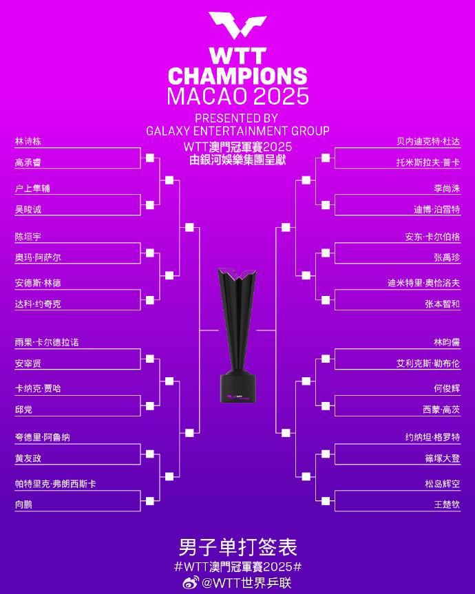 北京时间9月7日,WTT澳门冠军赛男单签表出炉,朱雨玲和迪亚兹为男单抽签。王楚钦首轮对阵松岛辉空,国乒男单4人在上半区。